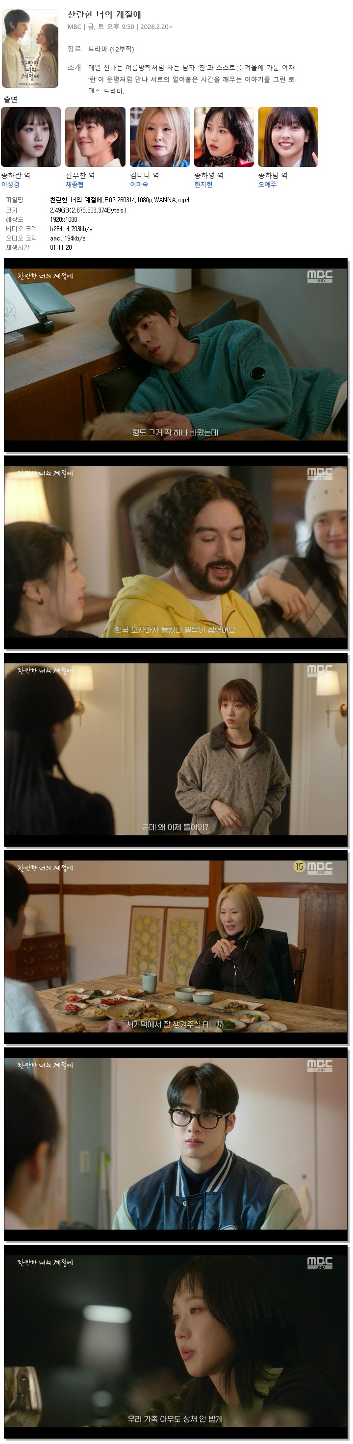 [MBC] Âù¶õÇÑ ³ÊÀÇ °èÀý¿¡.E07.260314.1080p.WANNA[À̼º°æ, äÁ¾Çù].mp4