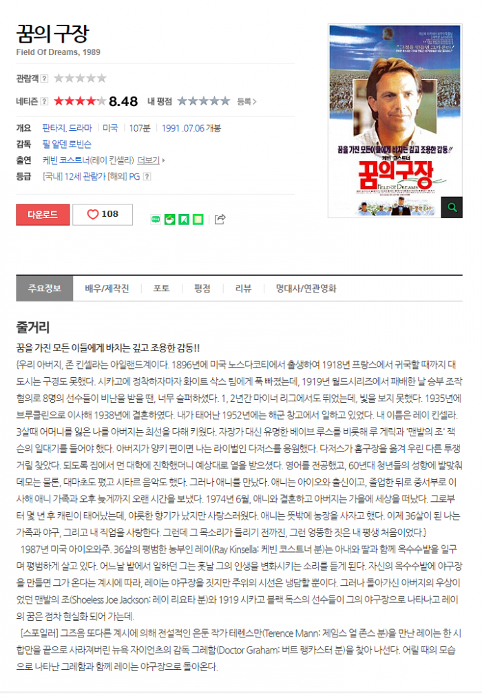 [ÆÇŸÁö.µå¶ó¸¶] Äɺó ÄÚ½ºÆ®³Ê ÁÖ¿¬!!! ²ÞÀ» °¡Áø ¸ðµç À̵鿡°Ô ¹ÙÄ¡´Â ±í°í Á¶¿ëÇÑ °¨µ¿!!²ÞÀÇ ±¸Àå.Field.of.Dreams.1989
